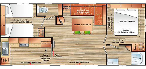 Le Mobile home type Confort est un mobile home 2 Chambres à toit deux pentes .